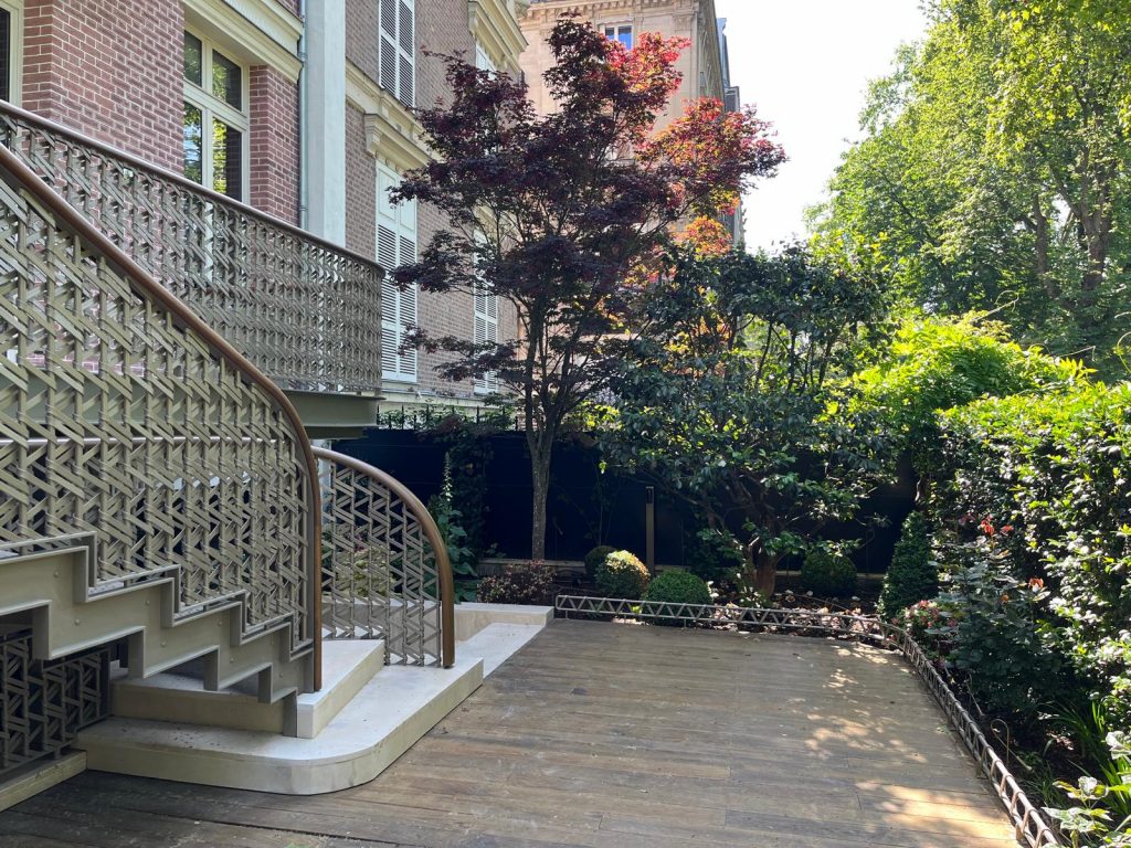 La propriété bénéficie de nombreux espaces extérieurs : une cour intérieure, des balcons et un jardin ouvrant directement sur le Champ de Mars.
